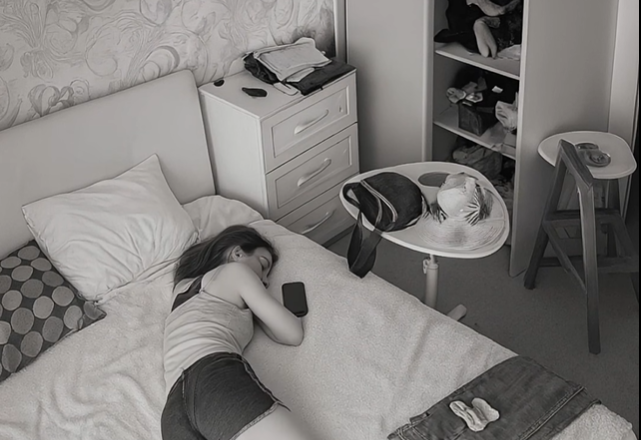 A hálószobám megjelent a képernyőn. Pont úgy, ahogy hagytam – rendetlenség, egy éjjeli lámpával, ami halványan megvilágította a szoba sarkát. A kamera az ajtó egy részét, az ágyat és a padló egy darabját fedte le. Először minden normális volt.