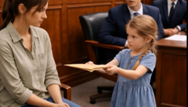 Die kleine Amelia stand mitten im Raum, zierlich, aber unerwartet stark. Ihre Hände zitterten, doch ihr Blick war entschlossen. Der Richter sah sie