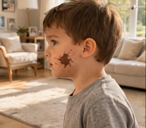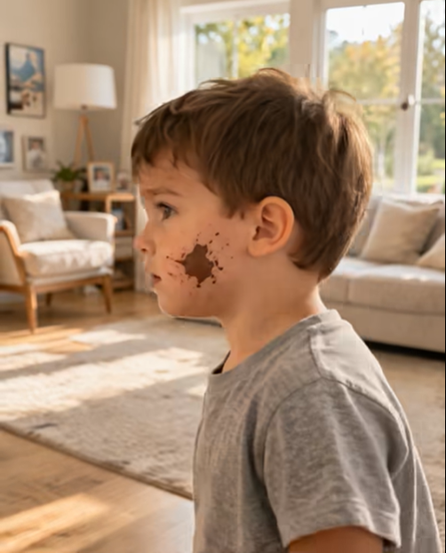 Ich erinnere mich noch genau an den Abend, als meine Befürchtungen zum ersten Mal Realität wurden. Liam spielte ruhig mit seinen Spielzeugautos im Wohnzimmer, lachte und rannte hin und her, ganz in seine eigene Welt vertieft. Als ich ihn ansah, stöhnte es in mir auf. Sein Gesicht sah nicht mehr so aus wie noch vor einer Woche. Der Fleck war dunkler geworden und leicht erhaben. Ich ging näher, hockte mich neben ihn und legte ihm sanft die Hand auf die Wange. „Liam, tut das weh?“ Ich fragte, bemüht, ruhig zu klingen. Er schüttelte nur den Kopf und lächelte, ohne zu ahnen, wie sehr mein Herz raste.