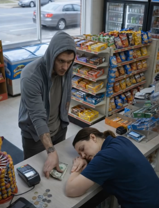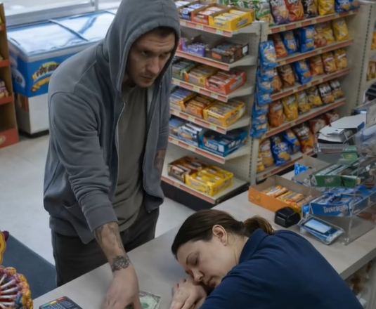 Drinnen herrschte eine ungewöhnliche Stille. Die Regale waren voll, aber es waren keine Kunden da. Nur das monotone Geräusch der Kühlgeräte und der ferne Lärm der Straße. Und hinter der Theke schlief die Kassiererin – ein junges Mädchen. Ihr Kopf war nach vorn gesunken, ihre Hände ruhten schlaff auf der Tischplatte. Die Kasse war geöffnet. Die Geldscheine lagen sichtbar, fast schon ausgestellt.