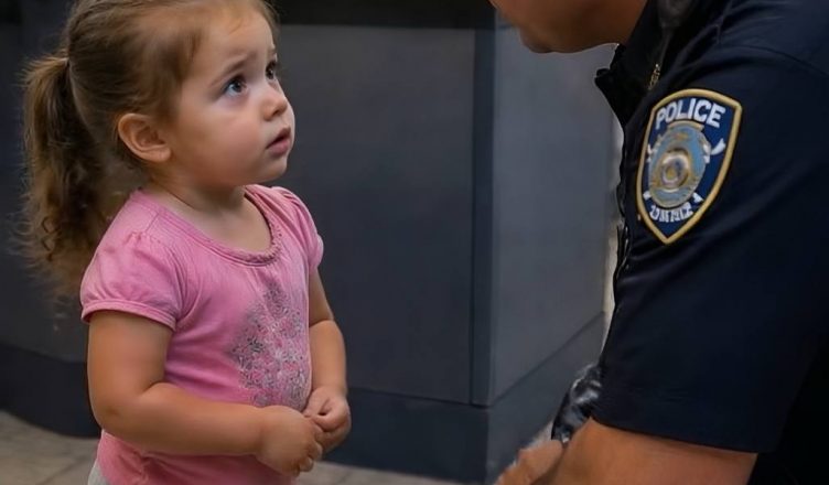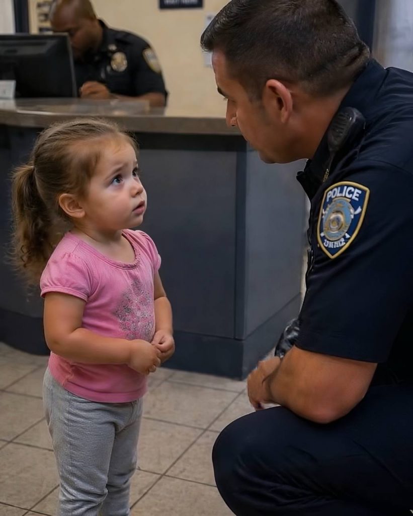 A kislány a kis keze fejével törölte le a könnyeit. A válla remegett, de próbált bátor maradni. A rendőr továbbra is térdelt előtte, nyugodtan és türelmesen.