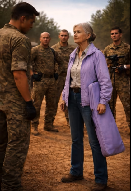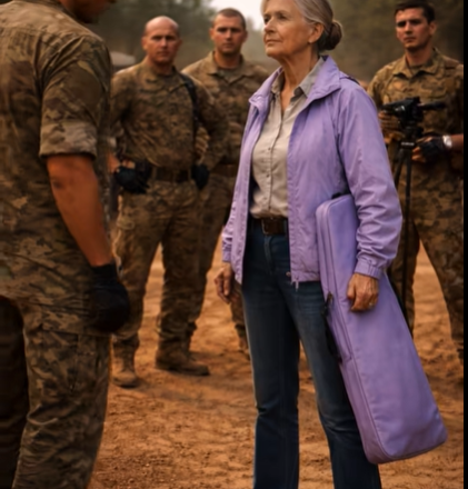 Nejdřív jeden voják, pak druhý, a během pár sekund už se celá řada dívala na ženu, jako by tam omylem zabloudila z jiného světa. Mírně kulhala, pohybovala se pomalu, ale jistě. V ruce nesla staré pouzdro v nápadně fialové barvě, které působilo spíš jako dětská hračka než vojenské vybavení.