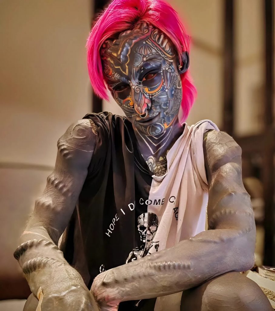 Képzelj el egy embert, akinek a teste vászonként szolgál a művészet számára, de ugyanakkor titokzatosságot is áraszt. Ma ez a lány a testének 99,98 százalékát tetoválással fedte le. Szinte nincs olyan hely, amit ne érintett volna a tinta – az arca, a nyelve, az ínye, a szemhéjai, sőt, még a szemfehérje is. Minden centimétere egy-egy jel, történet vagy szimbólum, amit ő maga választott.
