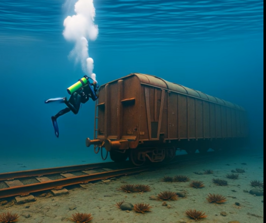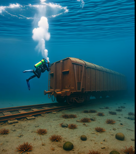 Amikor körülbelül húsz méter mélyre ért, a körülötte lévő világ végtelen sötétséggé változott, amelyet csak a zseblámpája fénykúpja vágott meg. Mindenhol csend volt. Csak a saját lélegzete visszhangzott a maszkból, mint egy távoli visszhang. Hirtelen egy sötét sziluettet vett észre maga előtt emelkedni. Először azt hitte, hogy egy sziklaalakzat vagy egy régi hajó. De ahogy közelebb ért, megdermedt. Előtte a kocsik kiemelkedtek a homokból – az egész vonat, mélyen a felszín alá merülve.