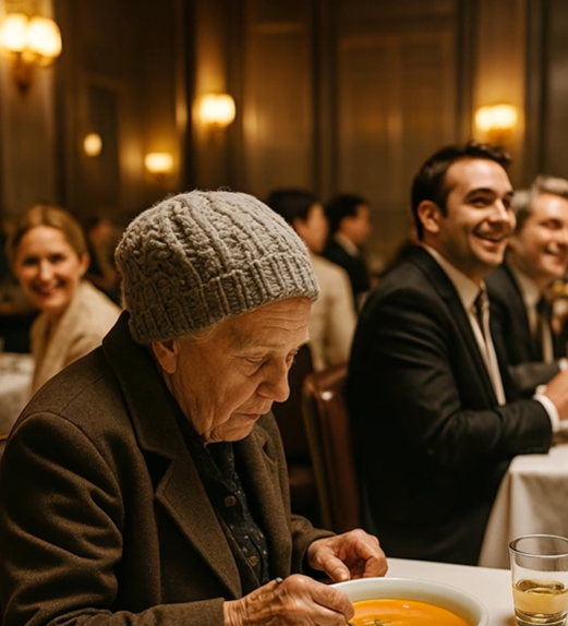 A szomszédos asztalnál ülő vendégek meghallották a beszélgetést, és azonnal nevetni kezdtek. – Azért jött ide, hogy levest egyen – gúnyolódott az aranyórás férfi. Nevetés kezdett terjedni a teremben, némelyek gúnyosan suttogtak, mások csak ironikusan mosolyogtak. Az egész légkört feszültség töltötte be – nem csak az ételről szólt, hanem az emberi méltóságról is.