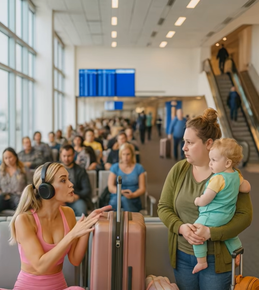 Köztük ült: egy rózsaszín melegítőben lévő nő, tökéletesen kisminkelve, a legújabb telefonnal és fejhallgatóval, amelyek fegyverként szolgáltak a körülötte lévő világ ellen. Olyan indokolatlan magabiztossággal ült, mint aki azt hiszi, hogy jobb helyre tartozik, mint bárki más.