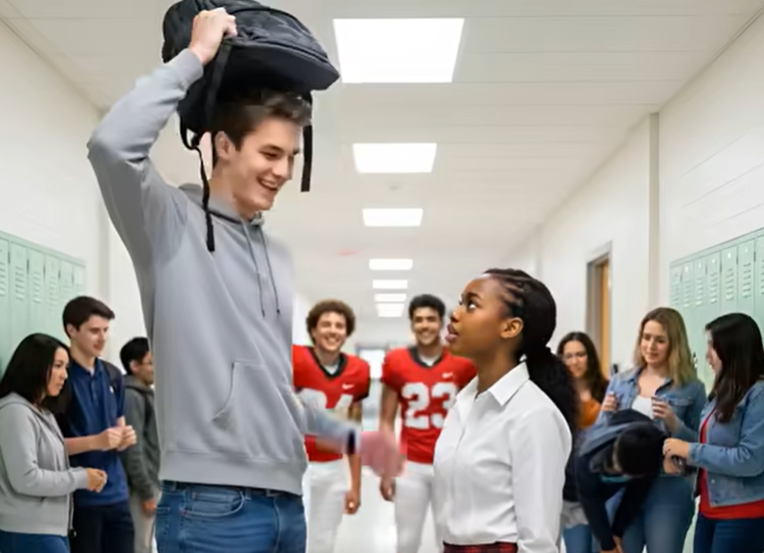 Der Flur vor den Spinden war überfüllt. Ein Gemisch aus Stimmen, Schritten und Gelächter. Victor stand an ihrem Spind, noch bevor sie ihn öffnen konnte. Er nahm ihre Tasche, hielt sie hoch über seinen Kopf und trat dramatisch einen Schritt zurück.