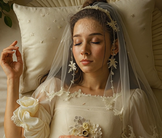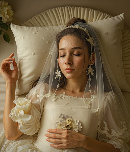 Und die Braut lag steif auf der weißen Decke, die Augen weit geöffnet, den Blick zur Decke gerichtet. Ihr Gesicht war verzerrt – nicht von Angst oder Schmerz, sondern von Schock. Ein dunkler Fleck zierte ihren Hals, als hätte sie jemand mit eiskalten Fingern berührt.