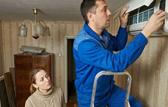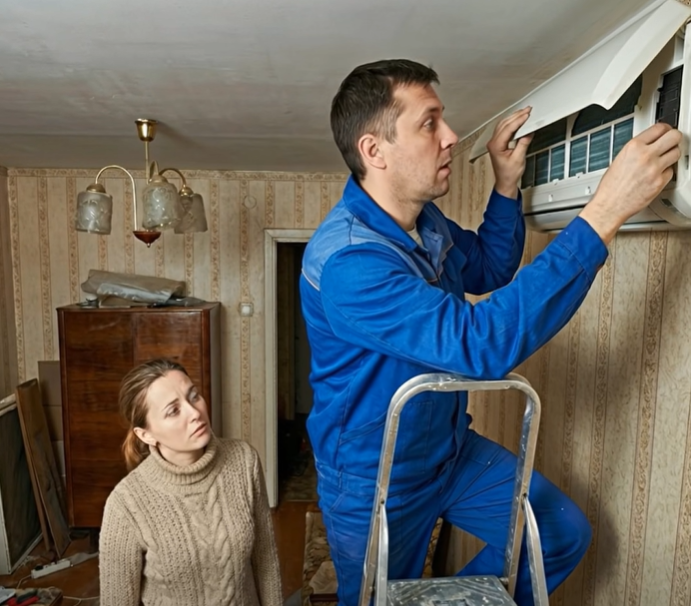 Eine Stunde später kam ein Mann in den Fünfzigern, in schlichter Arbeitskleidung, mit einem Werkzeugkasten. Ruhige Stimme, routinierte Bewegungen. Er untersuchte das Gerät, stellte die Leiter auf und nahm die Abdeckung ab.