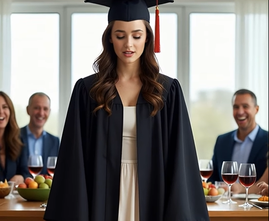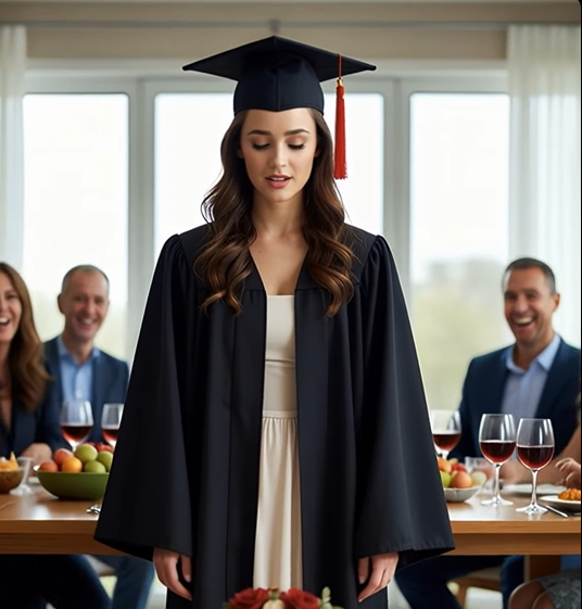 Když jsme vešli do jídelny, všichni už seděli. Tety, strýcové, bratranci, lidé, kteří se po zbytek roku sotva ozvali, ale dnes se tvářili slavnostně. Na stole stál dort. Bílý, jednoduchý, s mým jménem a malou figurkou v promočním taláru. Dívala jsem se na něj jen pár vteřin, ale byla jsem na něj hrdá. Byl symbolem všeho, co jsem vydržela.