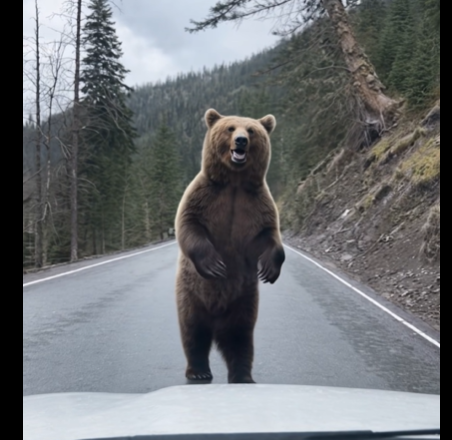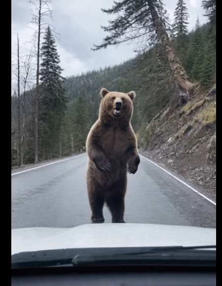 Ein einziger Gedanke schoss mir durch den Kopf: Jetzt geht es los. Die geschlossenen Fenster, das dünne Metall, das Glas – plötzlich wirkte alles lächerlich zerbrechlich. Ich wusste, wenn er angriff, waren wir völlig schutzlos. Mein Mann ließ das Tier keine Sekunde aus den Augen. Wortlos legte er den Rückwärtsgang ein und fuhr langsam zurück. Der Bär beobachtete uns. Jeder Meter zurück schien endlos. Die Reifen rutschten leicht auf der nassen Straße. Wir wagten uns kaum zu bewegen, kaum zu atmen. Ich erwartete einen Schlag, einen Ruck, zersplitterndes Glas. Nichts dergleichen geschah.