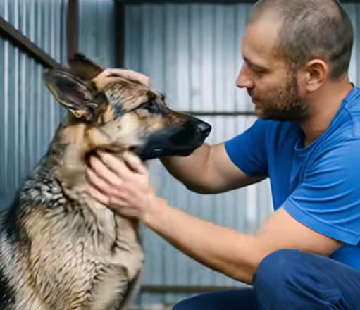 Nach kurzem Zögern nickte Irina und verschwand im Hinterhof. Wenige Minuten später brachte sie einen Hund herein, den alle kannten. Ein großer Deutscher Schäferhund mit einem verletzten Ohr und einem Körper voller alter Narben. Der Hund bellte nicht. Er knurrte nicht. Er stand einfach nur da und blickte die Leute an, als hätte er die Hoffnung auf etwas Gutes längst aufgegeben. Sein Name war Shadow.