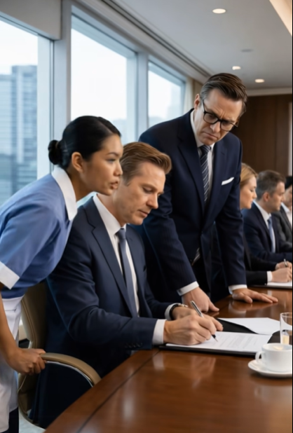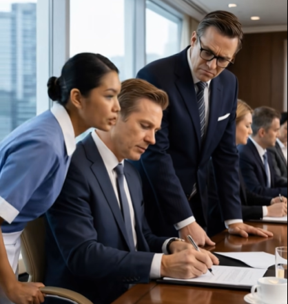 Velký stůl z tmavého dřeva byl připraven na podpis smlouvy, která měla změnit budoucnost celé společnosti. Na jedné straně seděl prezident a generální ředitel firmy, muž známý svou chladnou rozhodností a schopností uzavírat obchody, o kterých ostatní jen snili. Naproti němu seděla delegace německých investorů, jejichž kapitál mohl otevřít dveře na evropský trh.